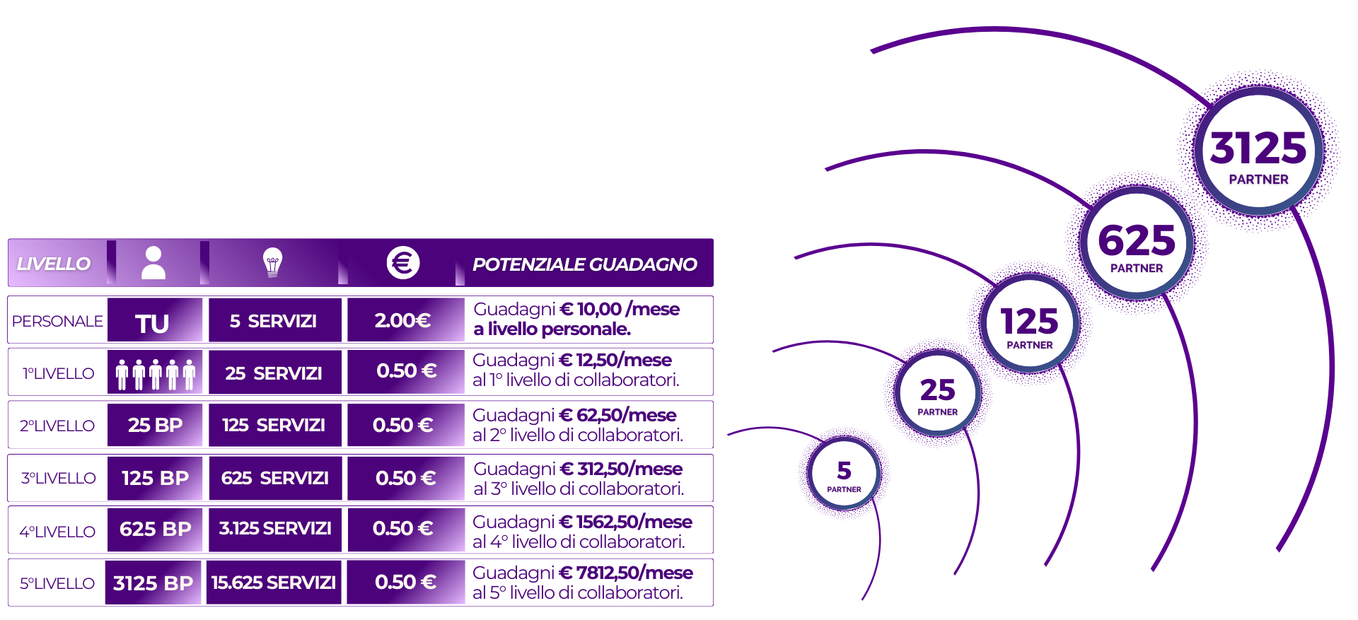 Il potenziale di guadagno del Piano Royalties è dimostrato tramite un esempio grafico di una struttura commerciale che si espande su una matrice di 5. Ognuno di loro acquisisce personalmente 5 servizi di energia elettrica e/o gas metano.